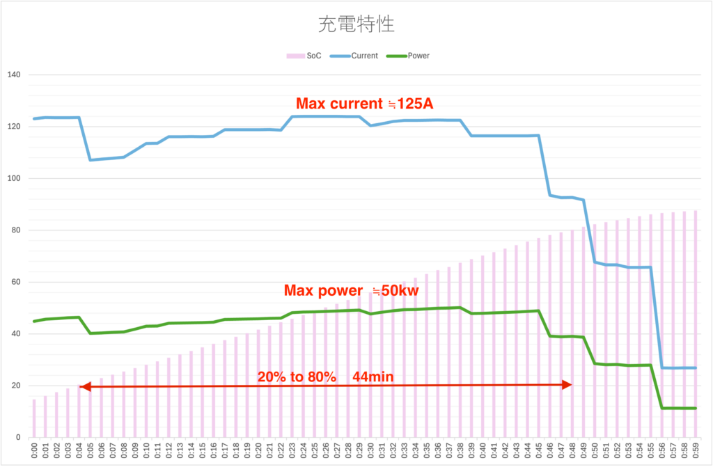 カタログスペックでよく見る、20%から80%まで充電するための時間は、この結果から44分となります。